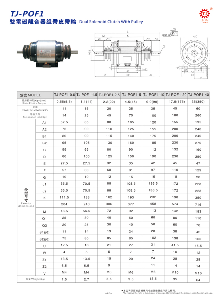 以下是双电磁离合器带皮带轮,双电磁离合器POF1型选型参数图