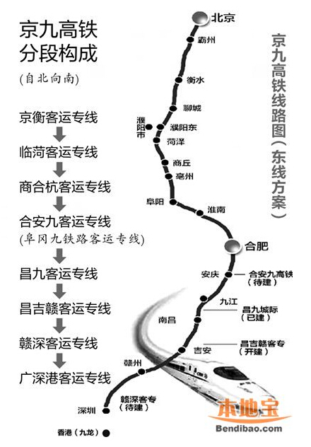 京九高铁又称京九客运专线,线路全长2000公里,设计时速为350公里,北起北京,跨越京、冀、鲁、豫、皖、赣、粤七个省级行政区,南至深圳,连接香港九龙,是连接环渤海和珠三角的重要高速铁路干线。途径北京、霸州、任丘、河间、衡水、清河(邢台)、临清、聊城、台前(濮阳)、梁山(济宁)、菏泽、商丘、亳州、阜阳、淮南、合肥、安庆、九江、南昌、吉安、赣州、河源、惠州、深圳,最后到达香港九龙。主要由北京至衡水客专(京霸段预计2019年建成)、临菏客专(临清—菏泽)、商合杭高铁(商丘到合肥段已经建设)、合安九客运专线(阜阳到九江段),昌九客运专线(九江—南昌)、昌赣客运专线(南昌—赣州)和赣深客运专线(赣州—深圳)和广深港客运专线(深圳—九龙)接驳而成。京九高铁商丘以南段将先期建成通车,待北京到商丘段的规划建设完成,京九高铁将逐步形成。本专题将为您介绍2015京九高铁最新消息和京九高铁通车时间,帮助您了解最新资讯,方便你的出行。