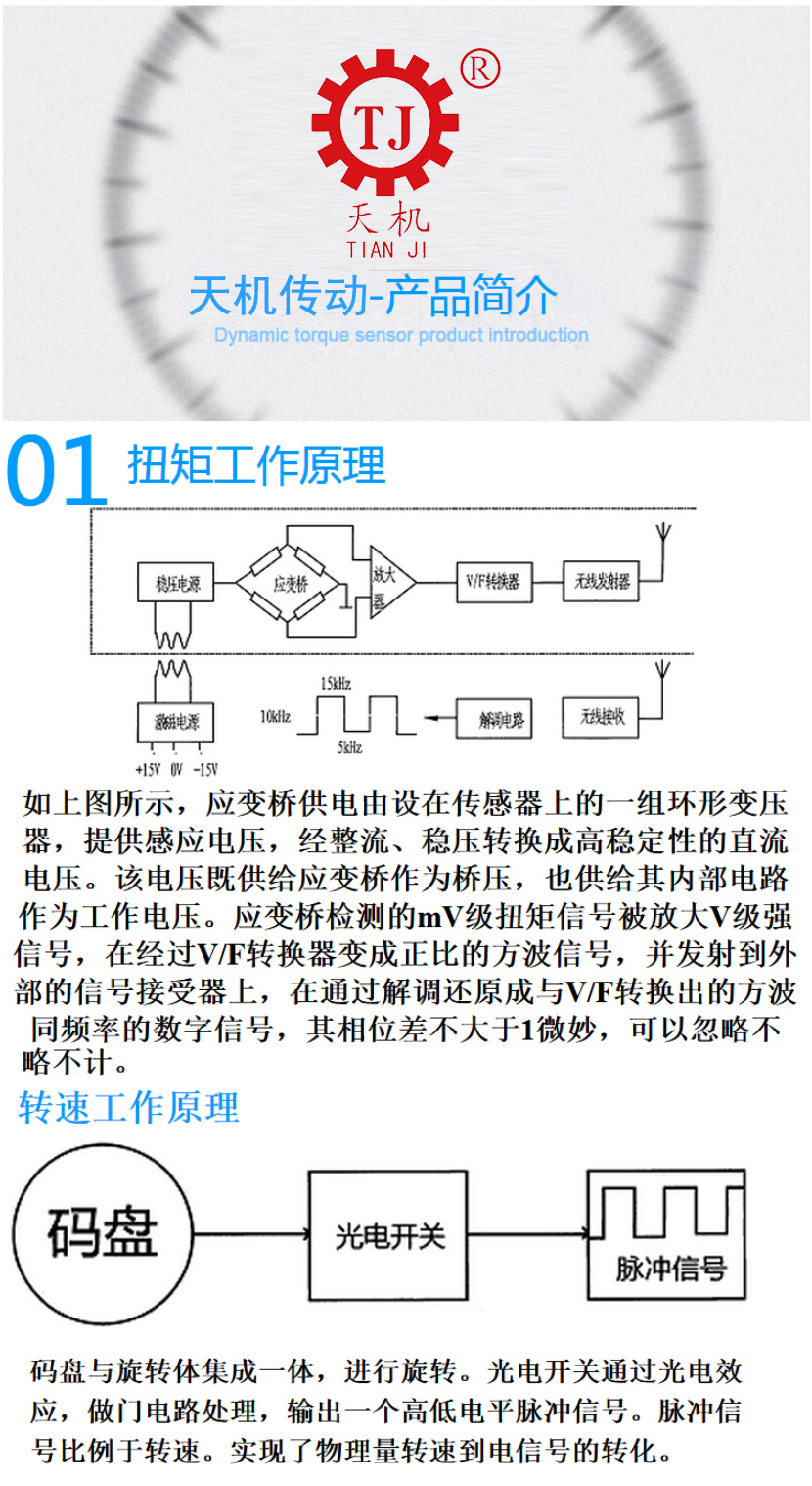 天机传动生产销售的扭矩传感器又称动态扭矩传感器或非接触扭矩传感器,是采用应变片电测技术 ,在弹性轴上组成应变桥,向应变桥提供电源即可测得该弹性轴受扭的电信号。将该应变信号放大后,经过压/频转换,变成与扭应变成正比的频率信号。该传感器可以精确测量各种扭力、转速及机械功率。扭矩传感器,动态扭矩传感器,非接触扭矩传感器特点: